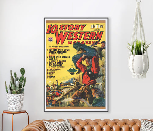 Vintage Western Pulp Magazine Poster – 10 Story Western Cover Art Print – Retro Cowboy Wall Decor – Rustic Wild West Man Cave Gift