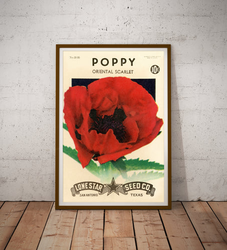 Vintage Poppy Flower Poster – Oriental Scarlet Seed Packet Wall Art, Botanical Print, Retro Garden Decor – California