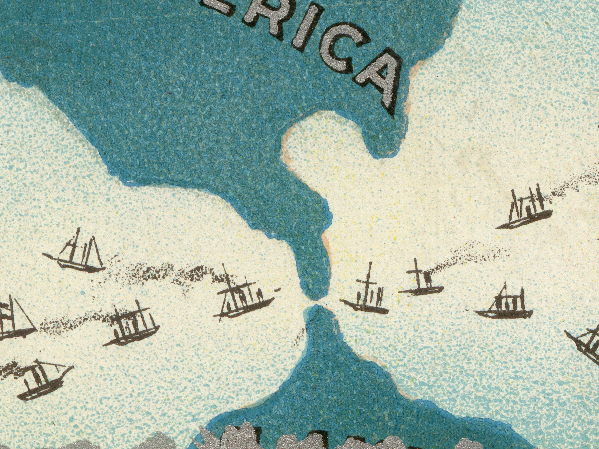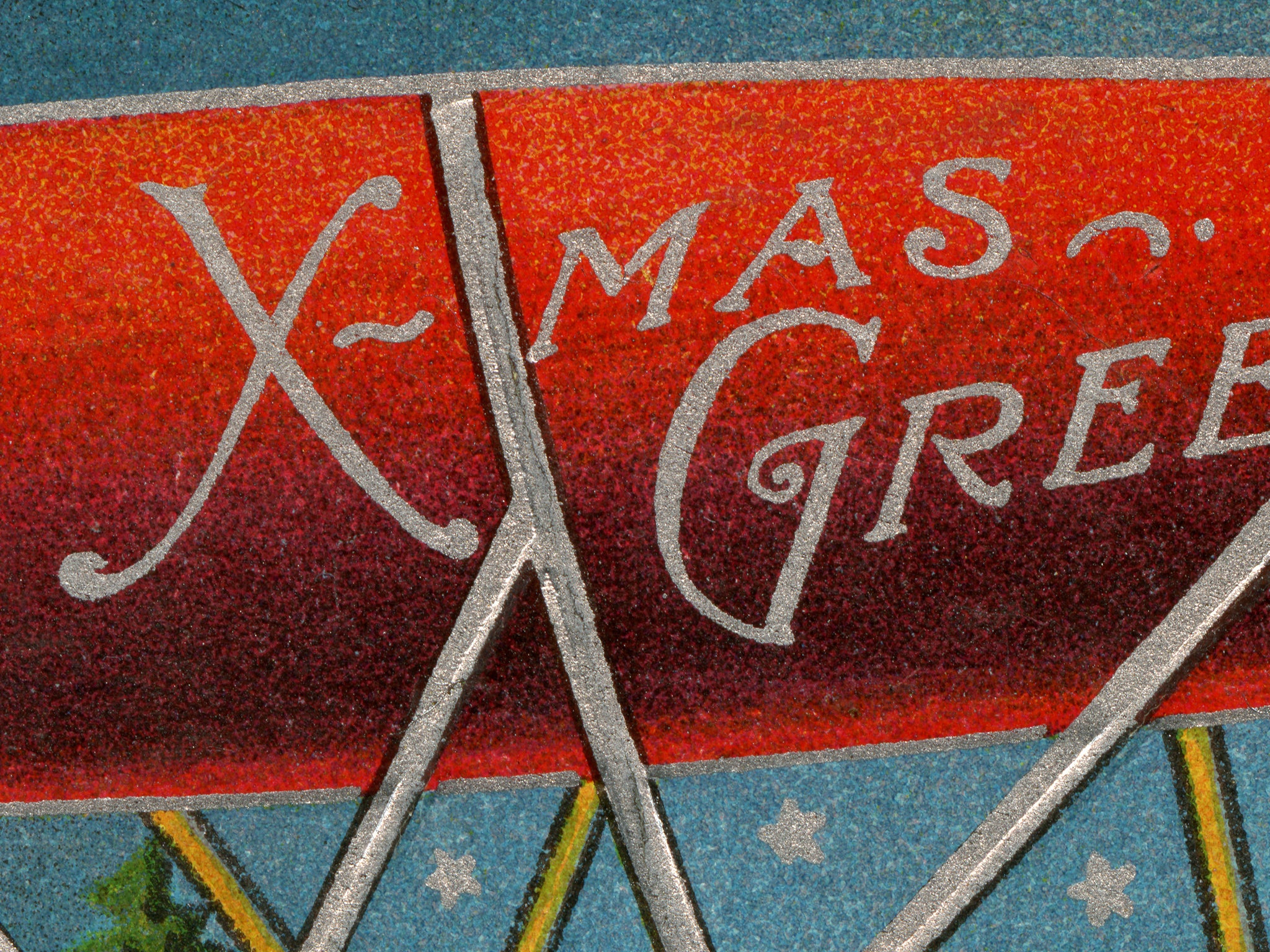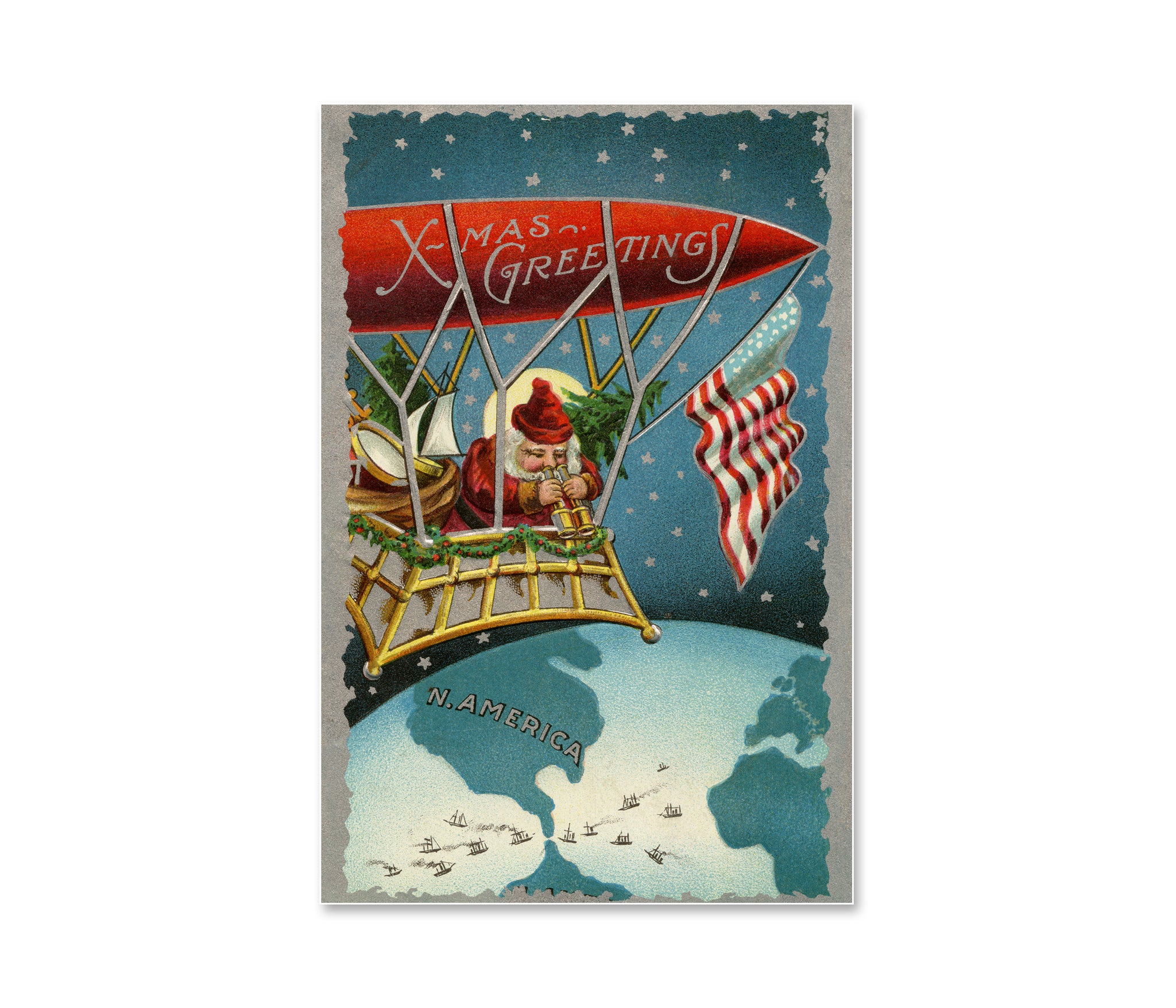 An incredible vintage illustration, from an embossed silver-foil postcard, of a jolly, plump, rosy-cheeked Santa Claus surveying the globe from the basket of his floating airship. Look at all of the toys he's brought for the good girls and boys! Definitely a perfect year-round decoration for those who absolutely love a whimsical Christmas vibe!