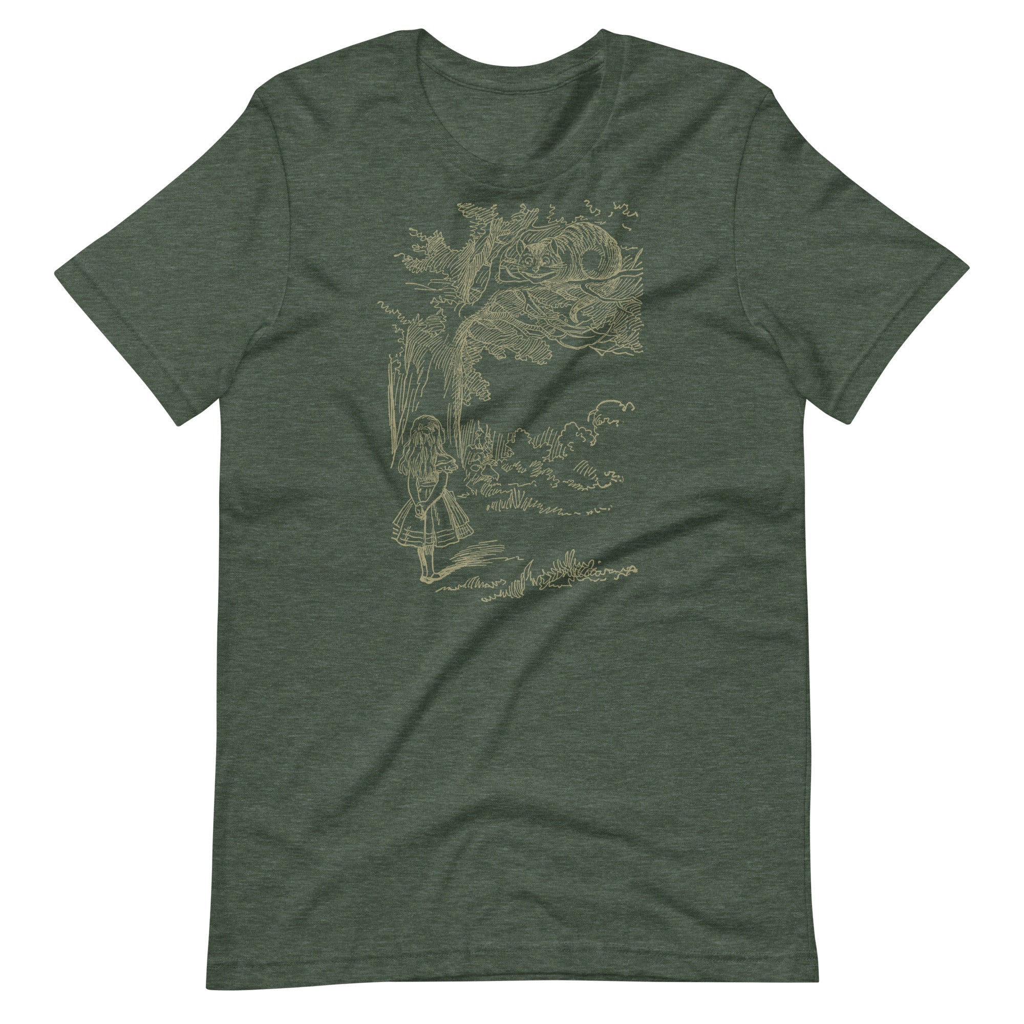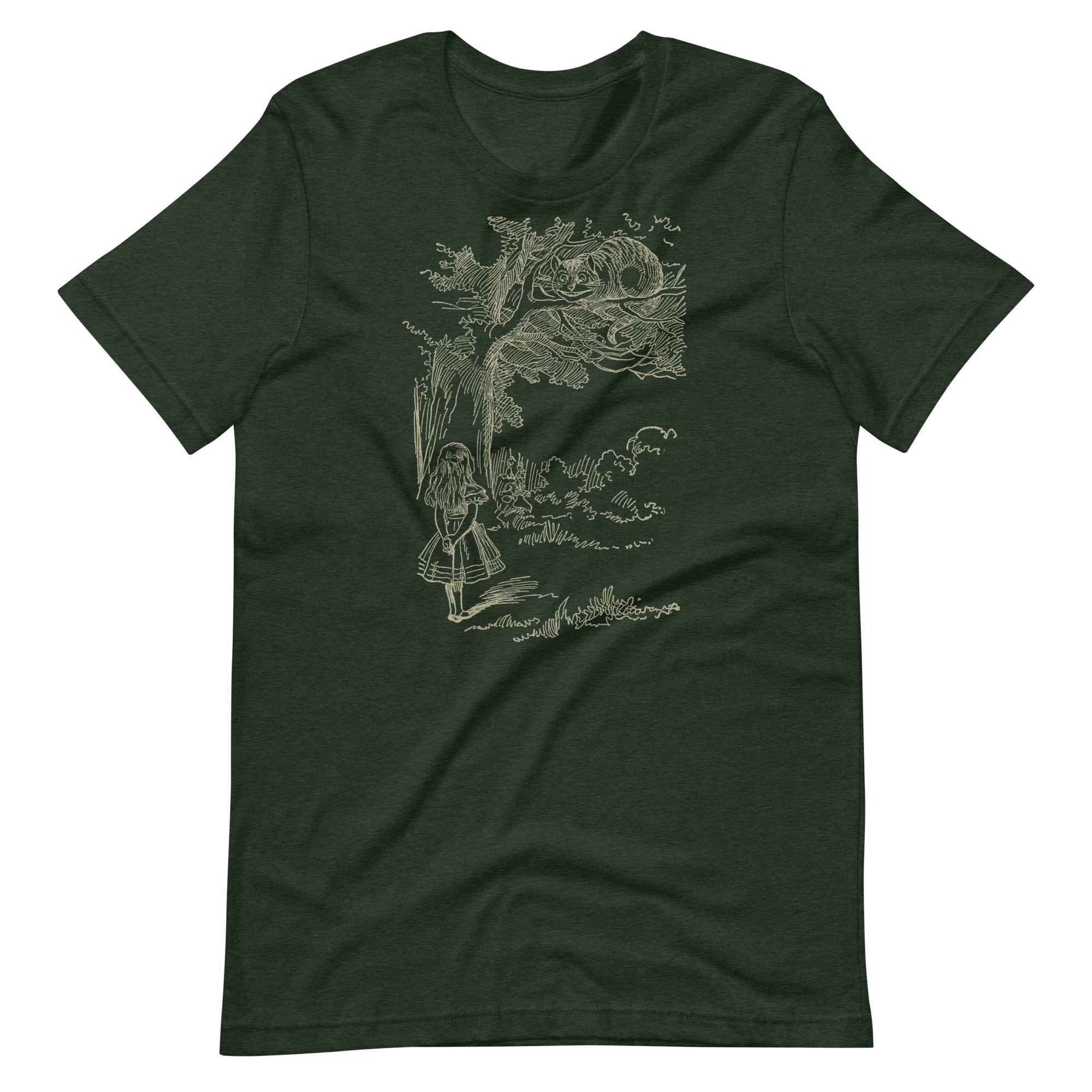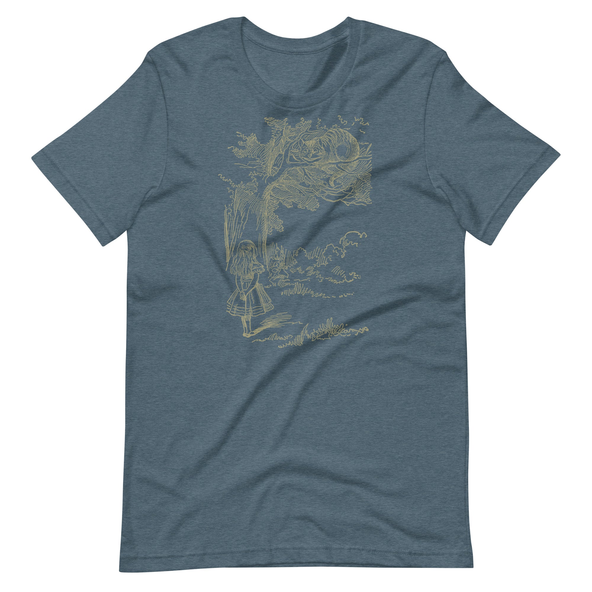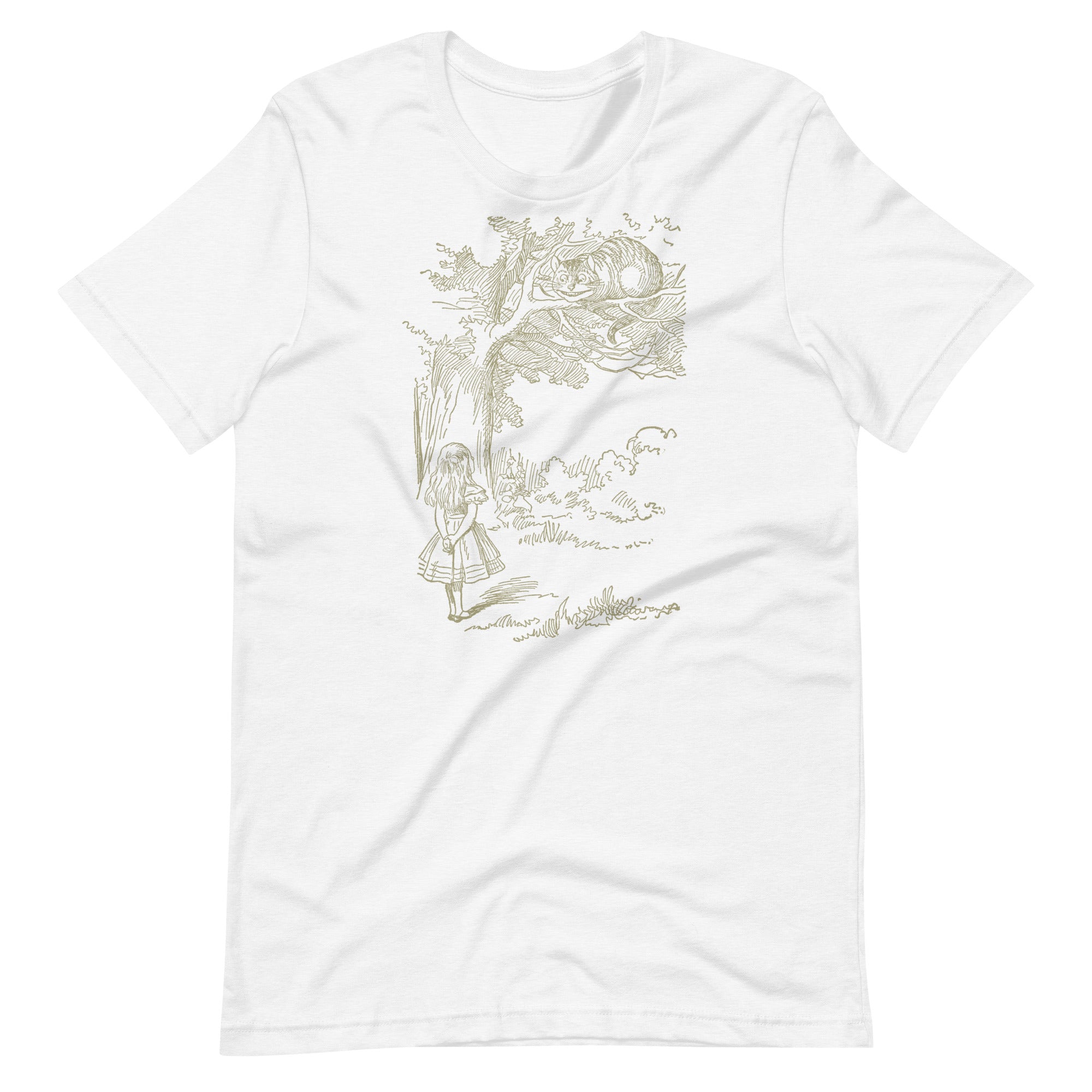 The image on this shirt comes from one of John Tenniel's original wood-engraved illustrations from Lewis Carroll's 1865 children's novel, Alice In Wonderland! This is the first interpretation of the infamous Cheshire Cat, a character who appears at the side of the Duchess, and is known for his unnerving and wide grin. He next appears to Alice high up in a tree, where he appears and reappears and provides the line: "we're all mad here"