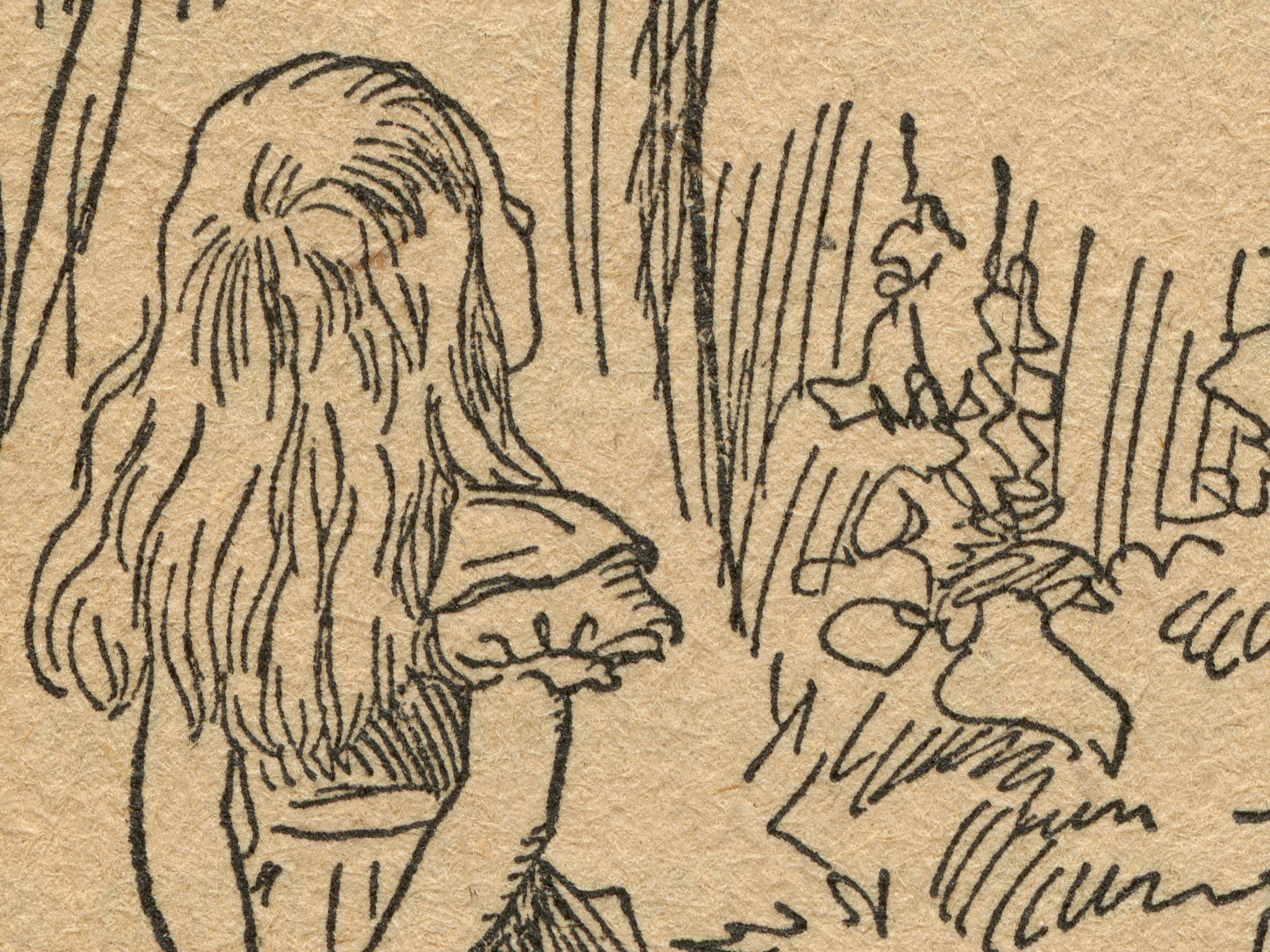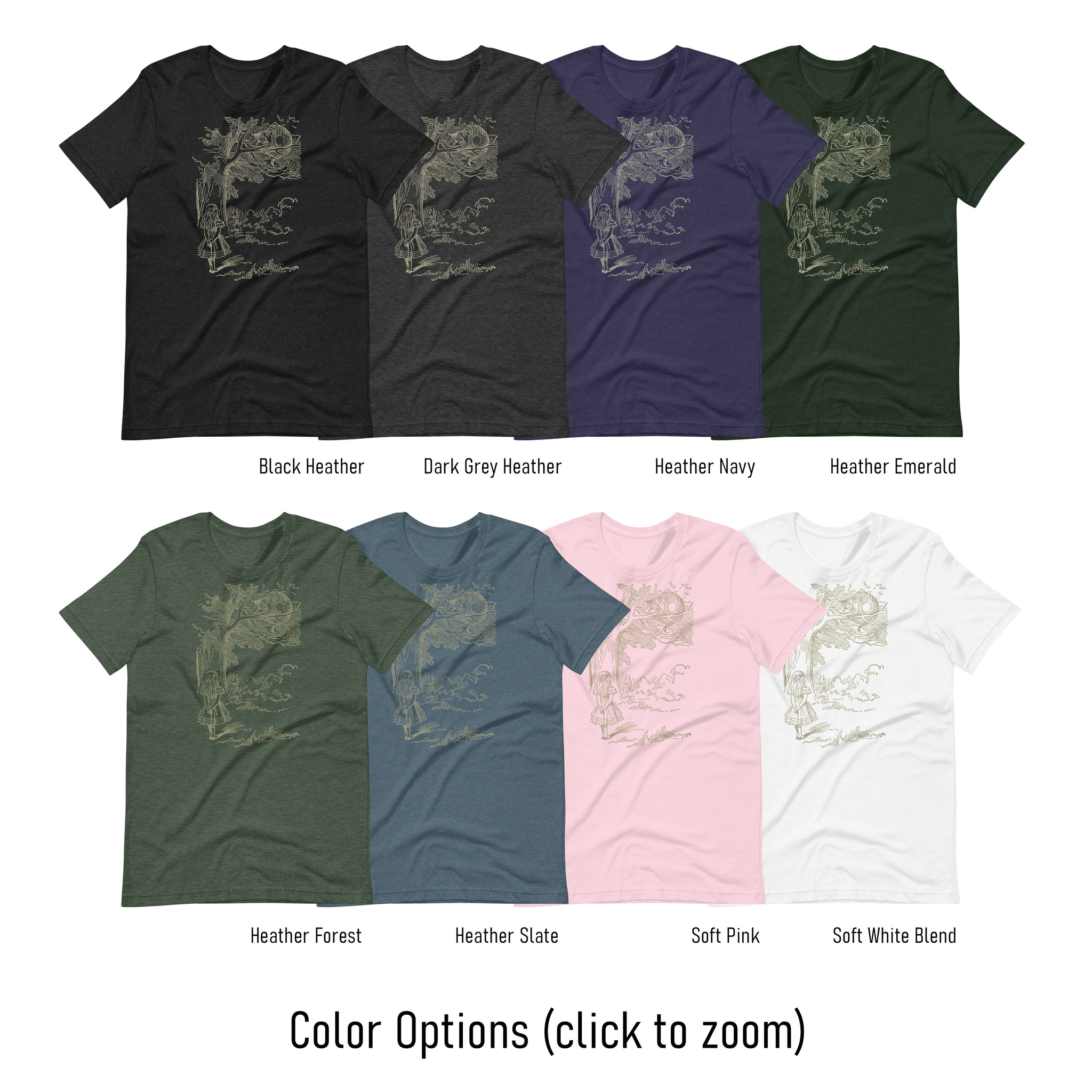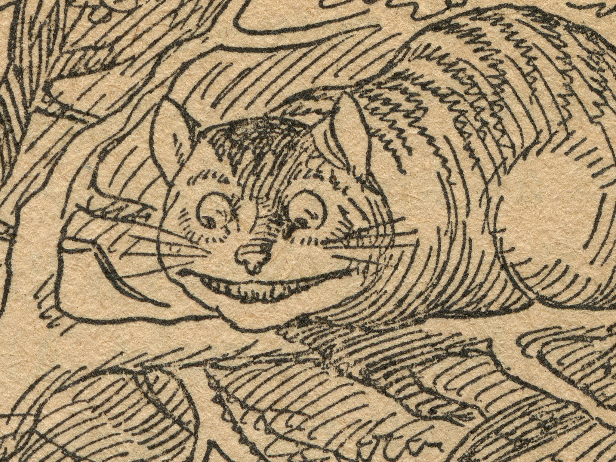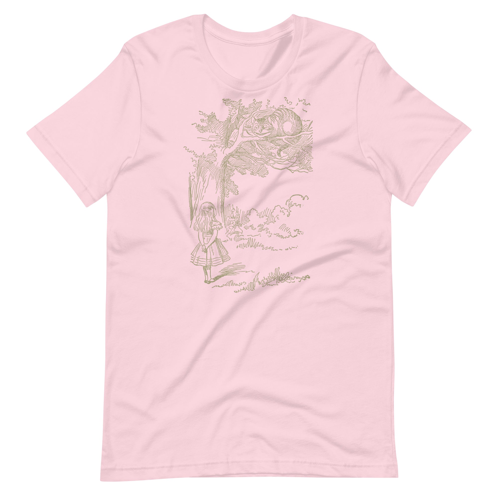 The image on this shirt comes from one of John Tenniel's original wood-engraved illustrations from Lewis Carroll's 1865 children's novel, Alice In Wonderland! This is the first interpretation of the infamous Cheshire Cat, a character who appears at the side of the Duchess, and is known for his unnerving and wide grin. He next appears to Alice high up in a tree, where he appears and reappears and provides the line: "we're all mad here"