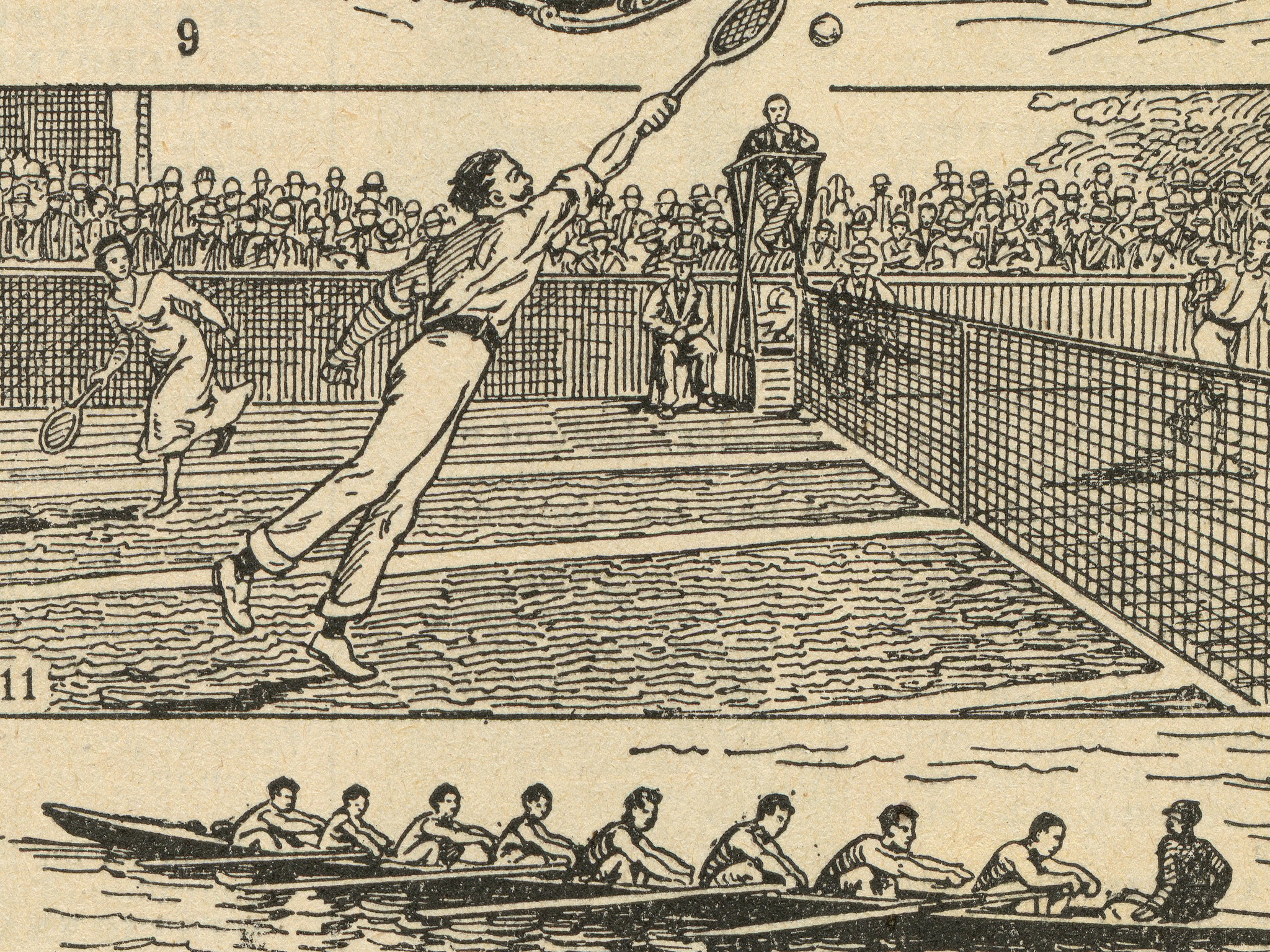 Bring timeless athletic charm to your walls with this vintage sports illustration sourced from a 1920s French dictionary. This beautifully detailed engraving captures early 20th-century scenes of running, long jump, discus throw, shot put, horse racing, cycling, rugby, golf, bobsledding, figure skating, tennis, rowing, and croquet — celebrating the golden age of sport and motion.