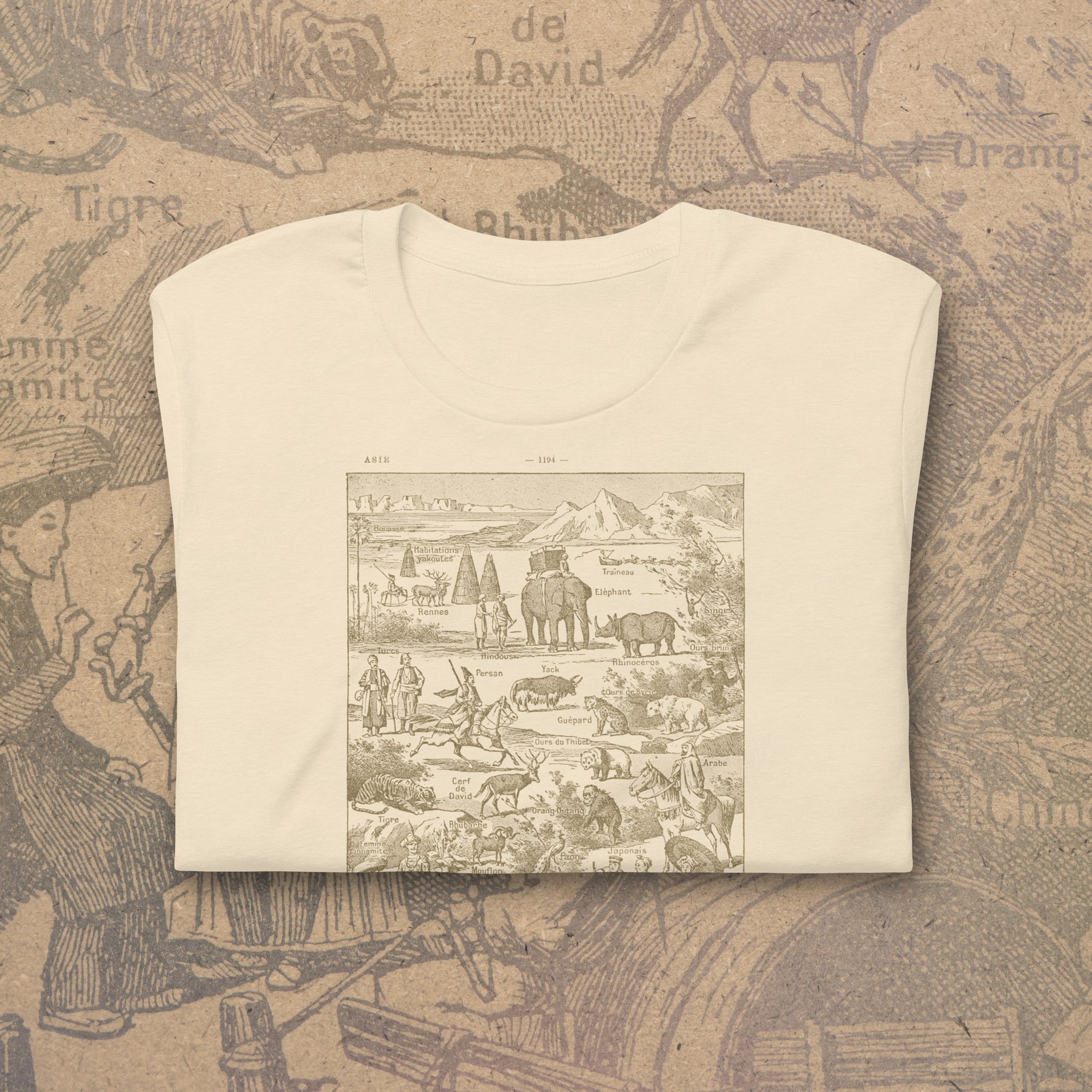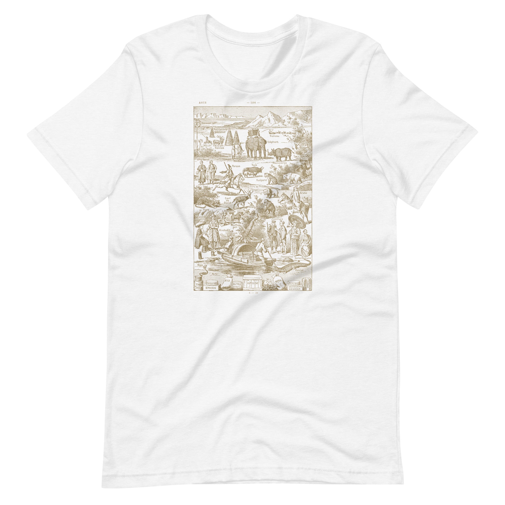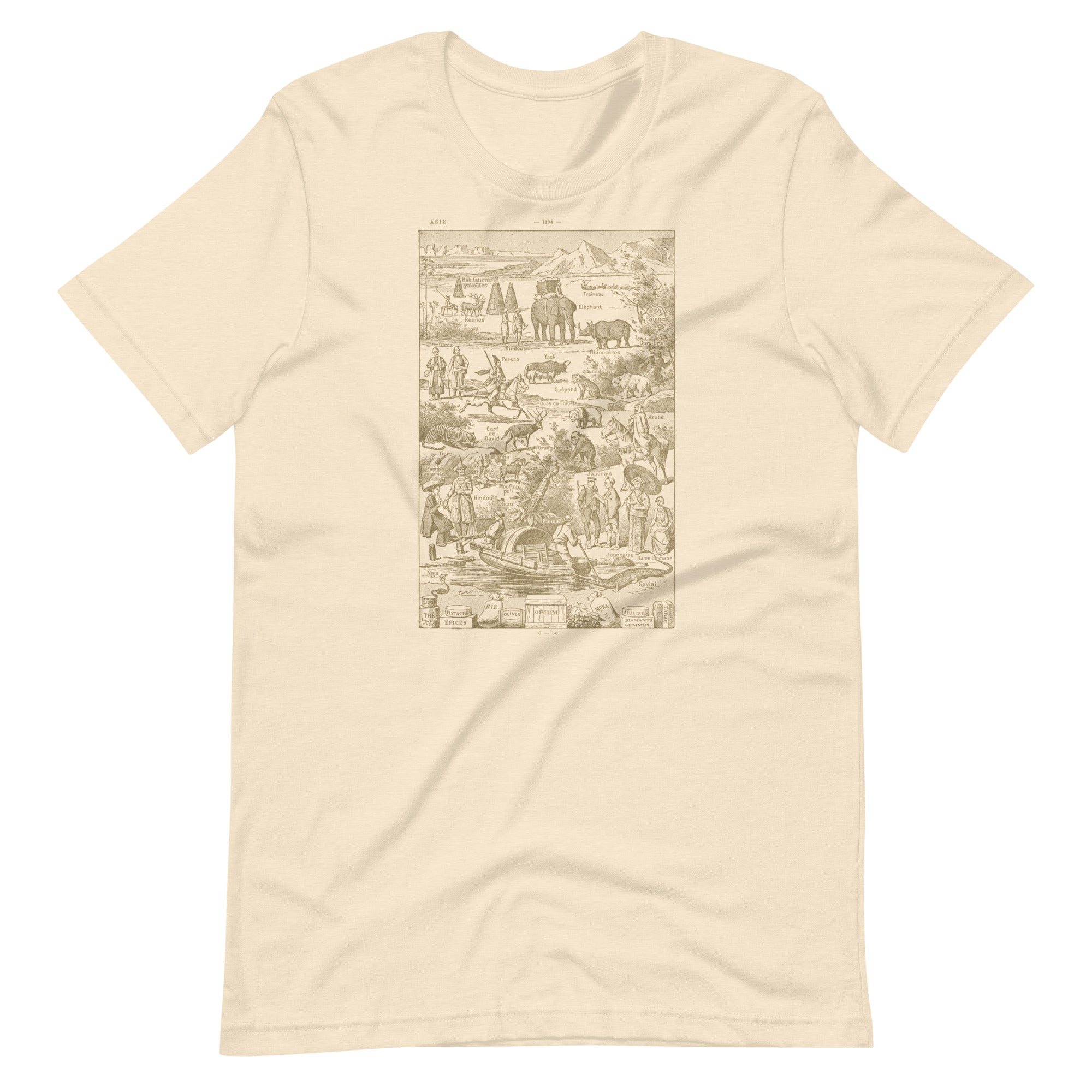 This tee features a charming vintage illustration of Asia packed with animals, people, plants, and curiosities from an old encyclopedia-style map. The image actually comes from a French dictionary from the 1930's, with truly hand-drawn linework and real aged paper. Elephants, tigers, rhinos, yaks, bears, spices, tea, opium, gems—it’s like a 19th-century curiosity cabinet turned into wearable art. The hand-drawn linework and aged paper look give it that perfectly imperfect antique vibe.
