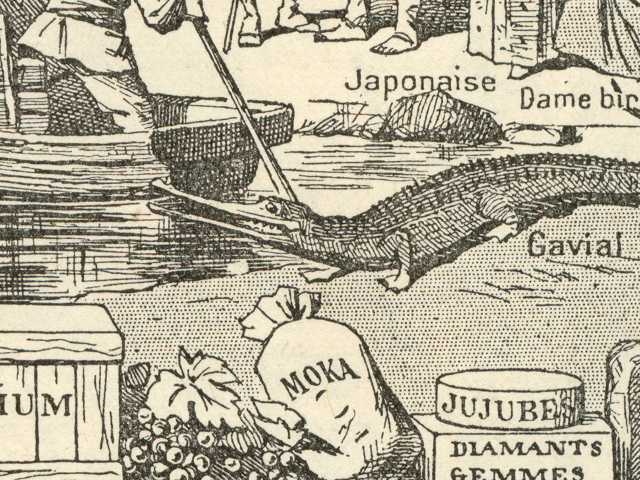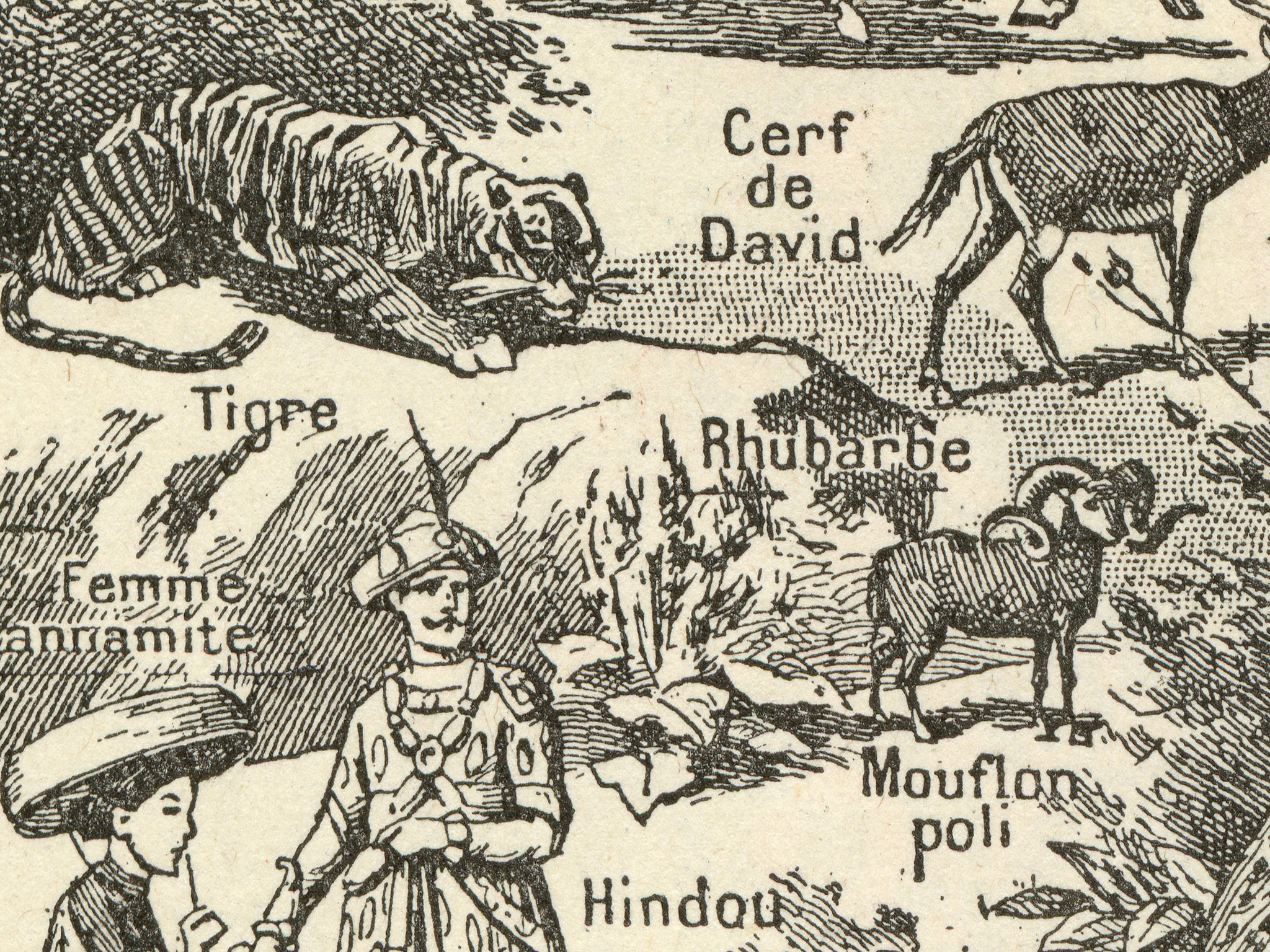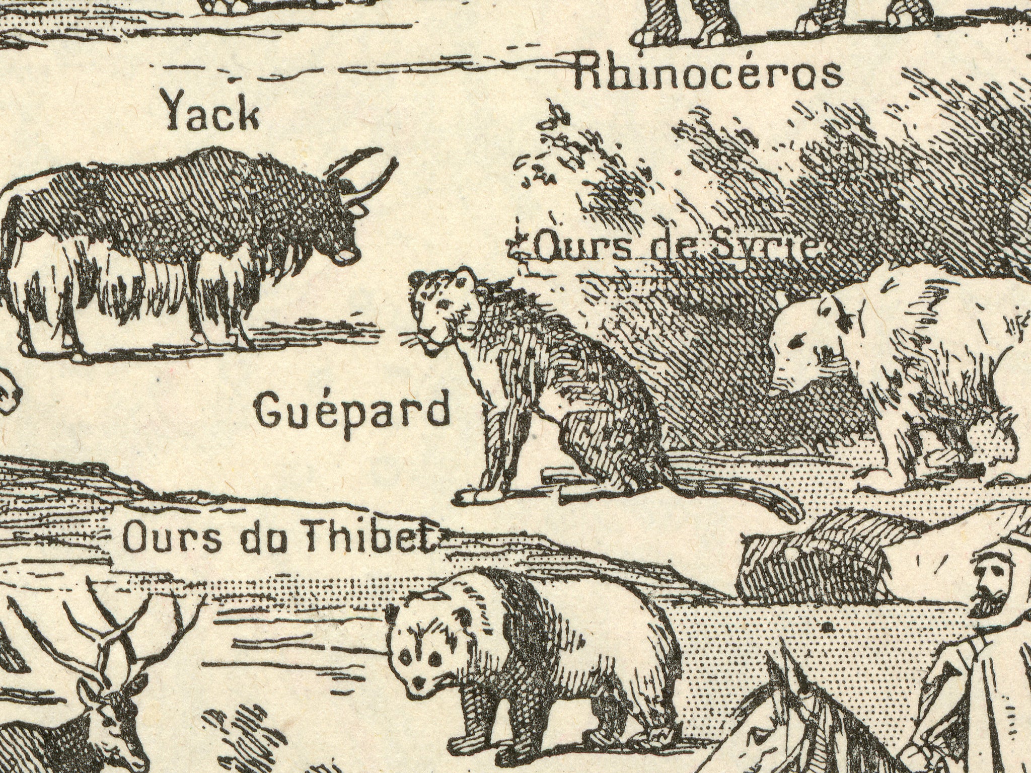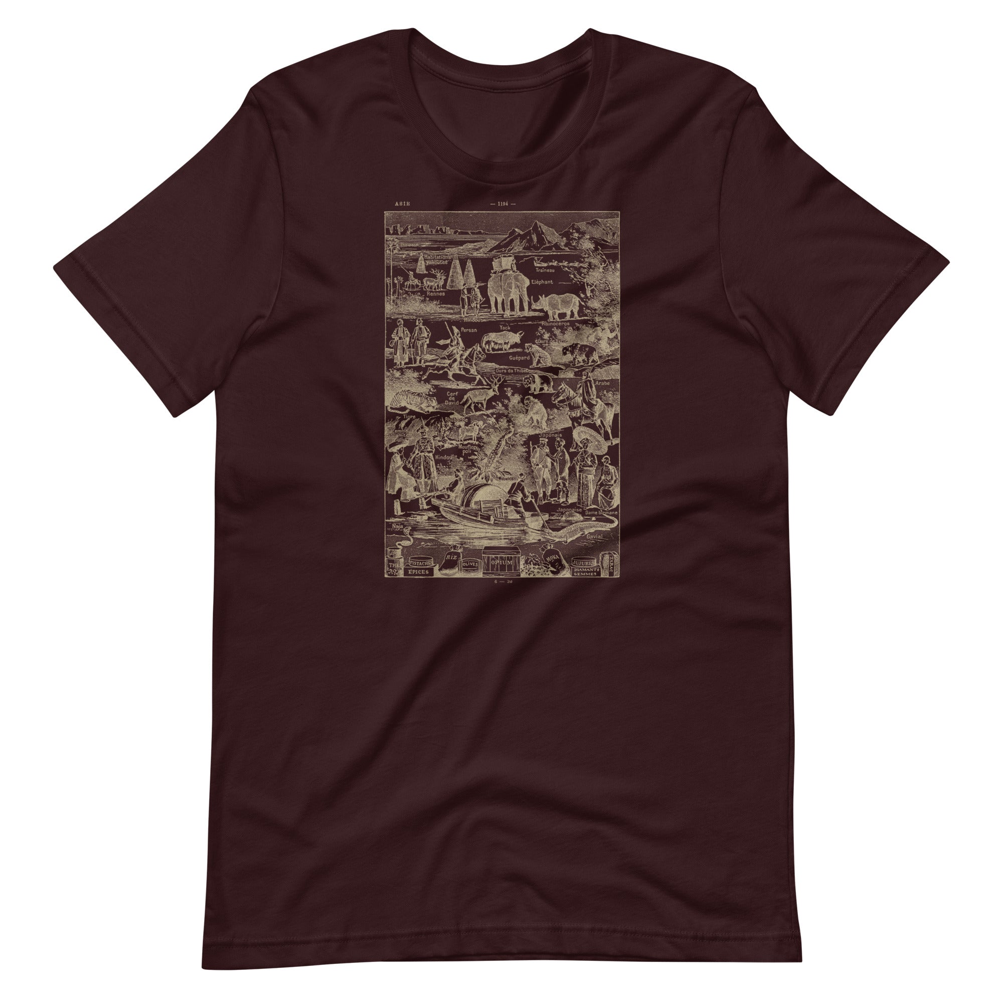 This tee features a charming vintage illustration of Asia packed with animals, people, plants, and curiosities from an old encyclopedia-style map. The image actually comes from a French dictionary from the 1930's, with truly hand-drawn linework and real aged paper. Elephants, tigers, rhinos, yaks, bears, spices, tea, opium, gems—it’s like a 19th-century curiosity cabinet turned into wearable art. The hand-drawn linework and aged paper look give it that perfectly imperfect antique vibe.