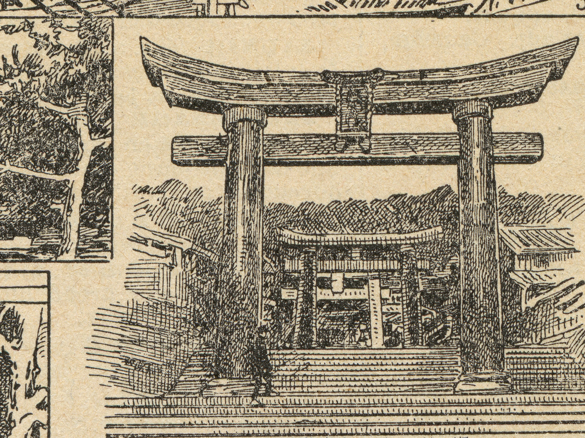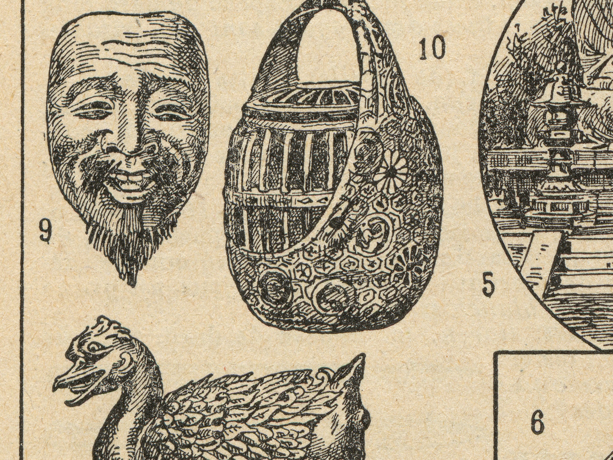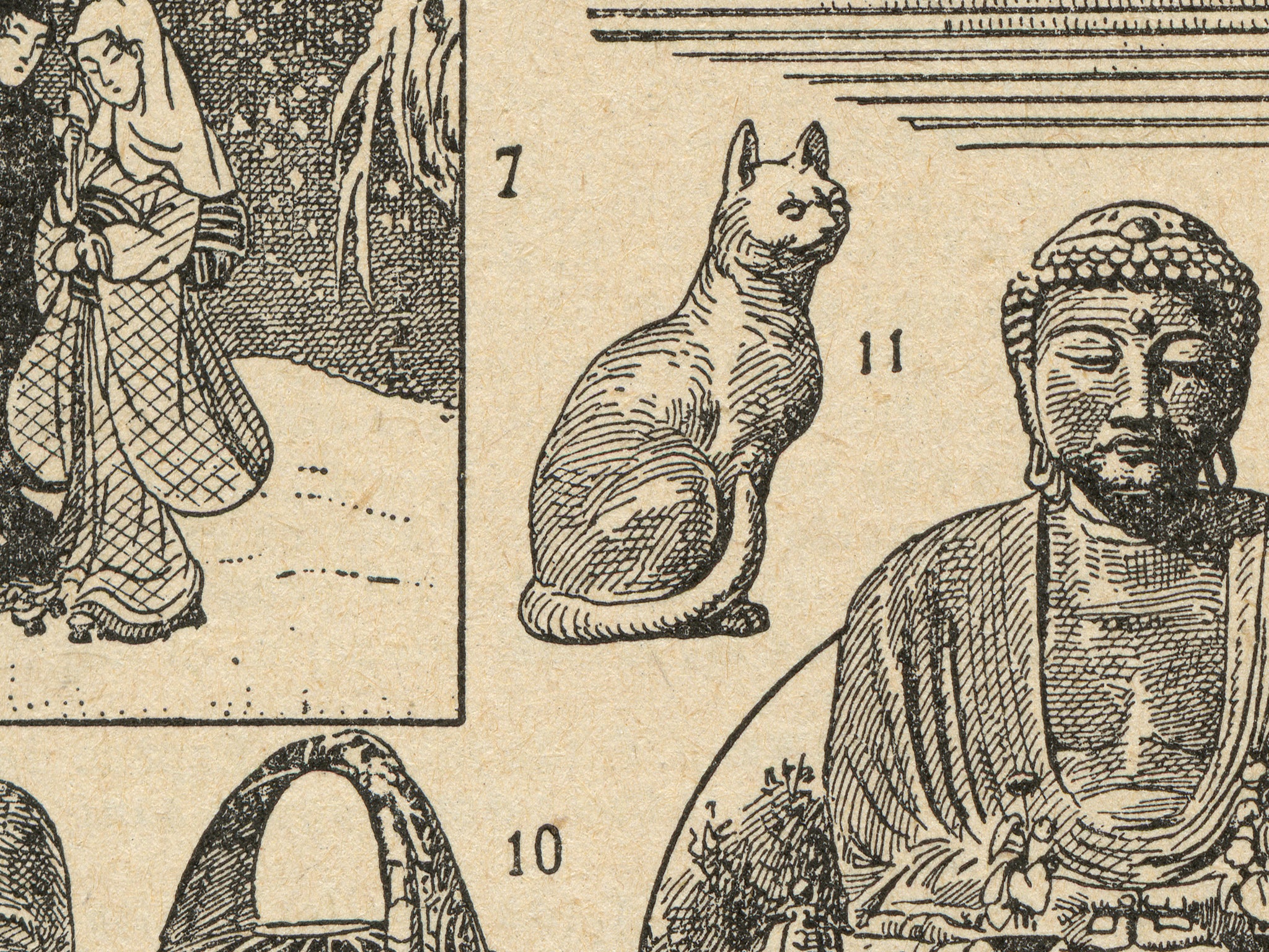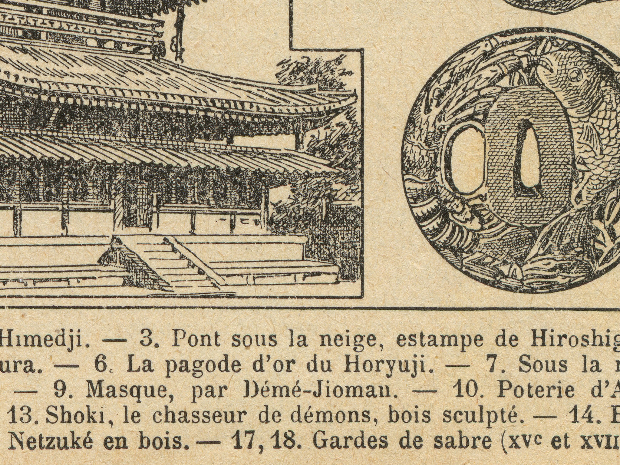 The Japanese themed imagery on this poster comes from the pages of a 1931 French dictionary. It includes example drawings of Japanese art, architecture, and culture; including the Yakushiji Pagoda, the Great Buddha of Kamakura, medicine boxes, art, paintings, pottery, wood carvings, sword guards, and even a porcelain cat!A very cool look at history, language, anthropology, and geography! The label list at the bottom is written in French.