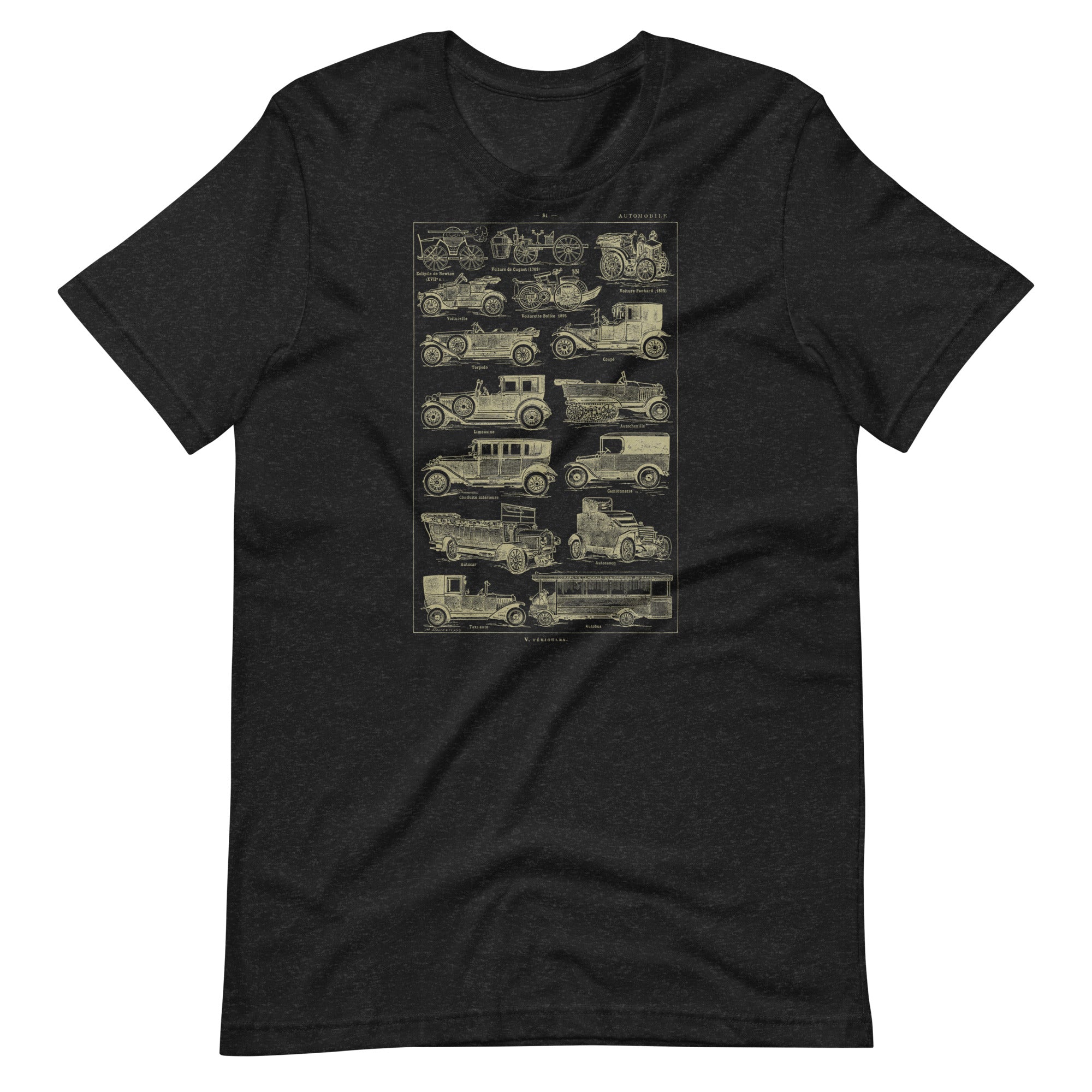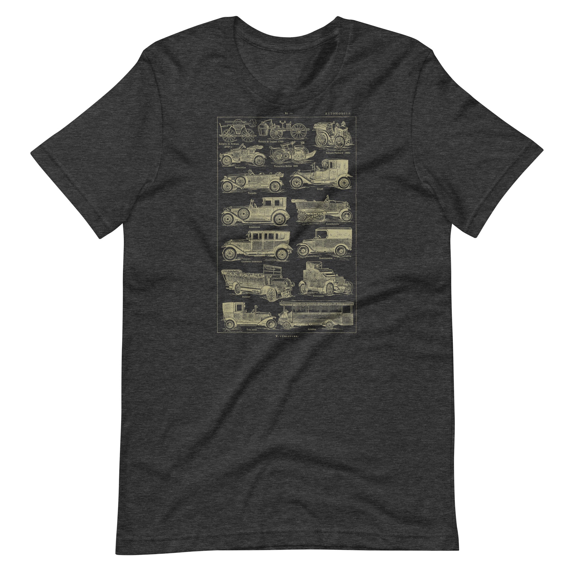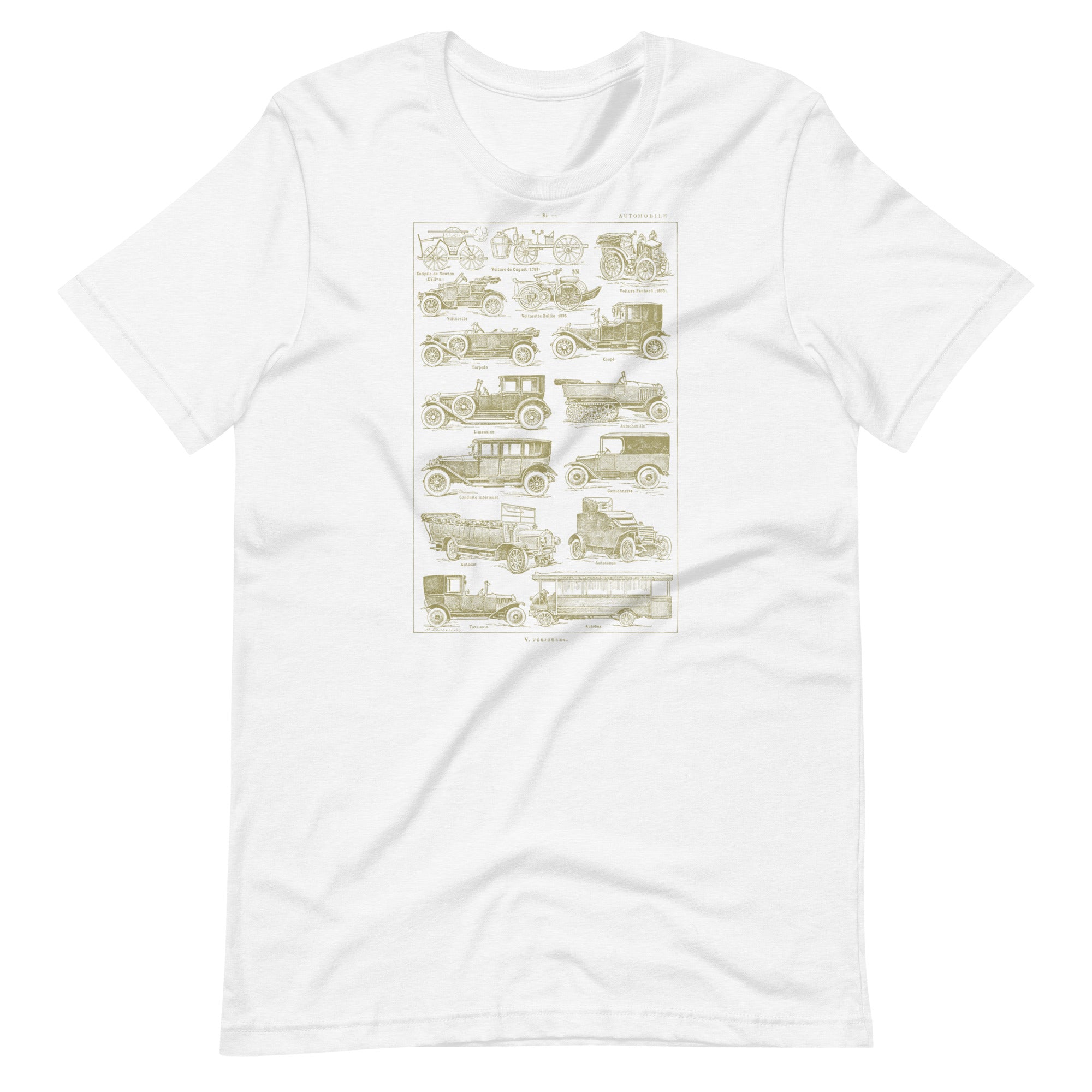 This vintage automobile t-shirt feels like a page torn straight from a 1930's French language dictionary - because it is! No AI design here - only real historic artwork. The design features a beautifully detailed antique illustration showing the evolution of early automobiles, from steam-powered curiosities to classic motorcars, buses, and taxis. Each vehicle is labeled in an old-world style, giving the shirt the look of a historical diagram. The warm, aged-paper tone of the artwork adds to its nostalgic, scholarly charm and makes it instantly eye-catching.