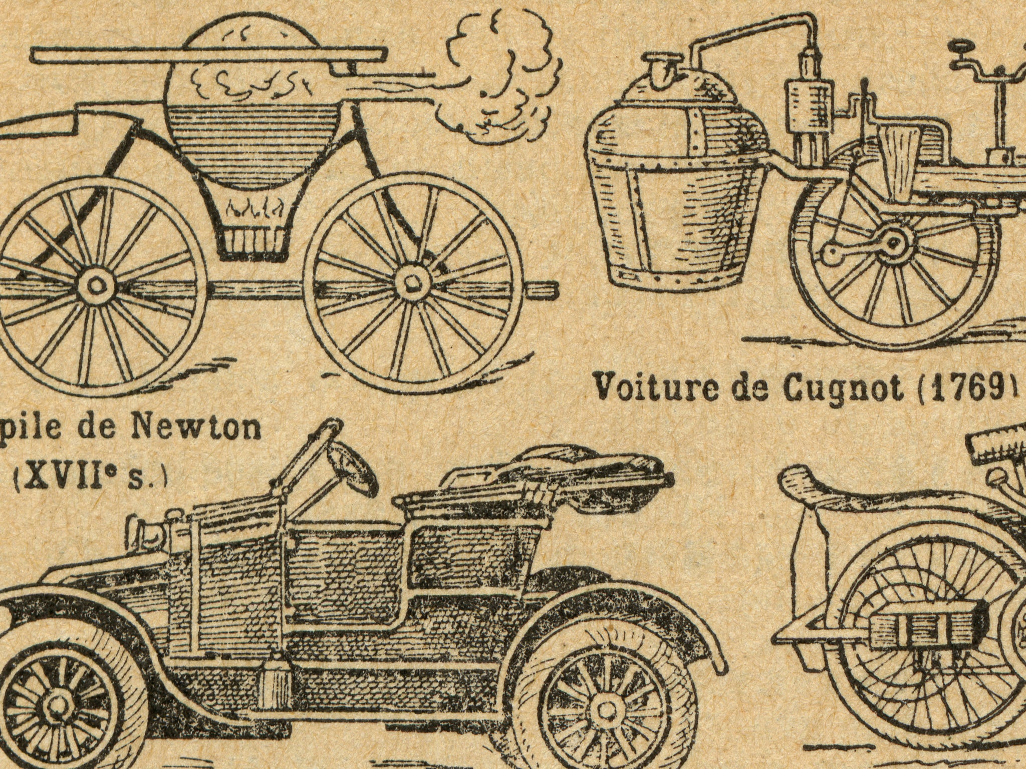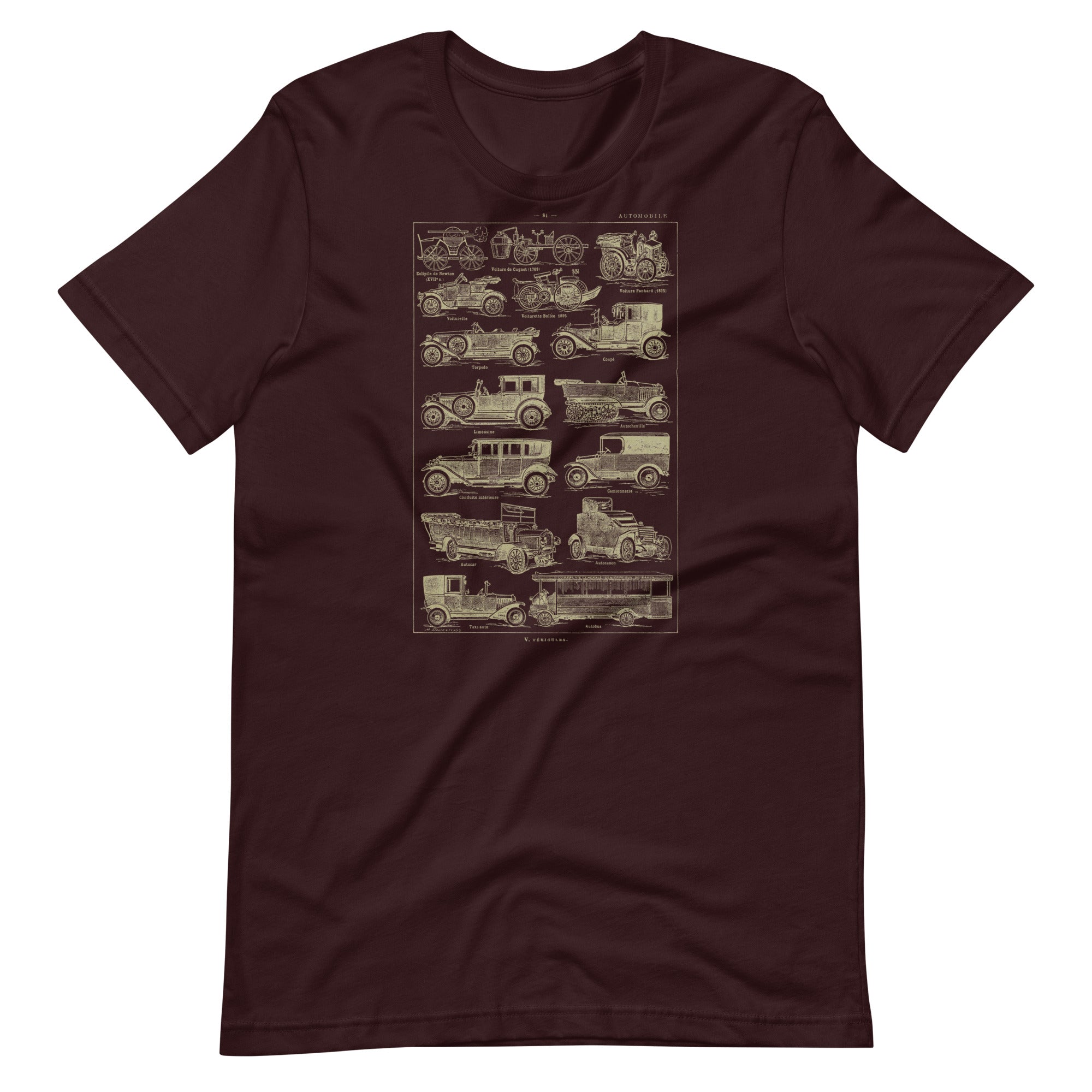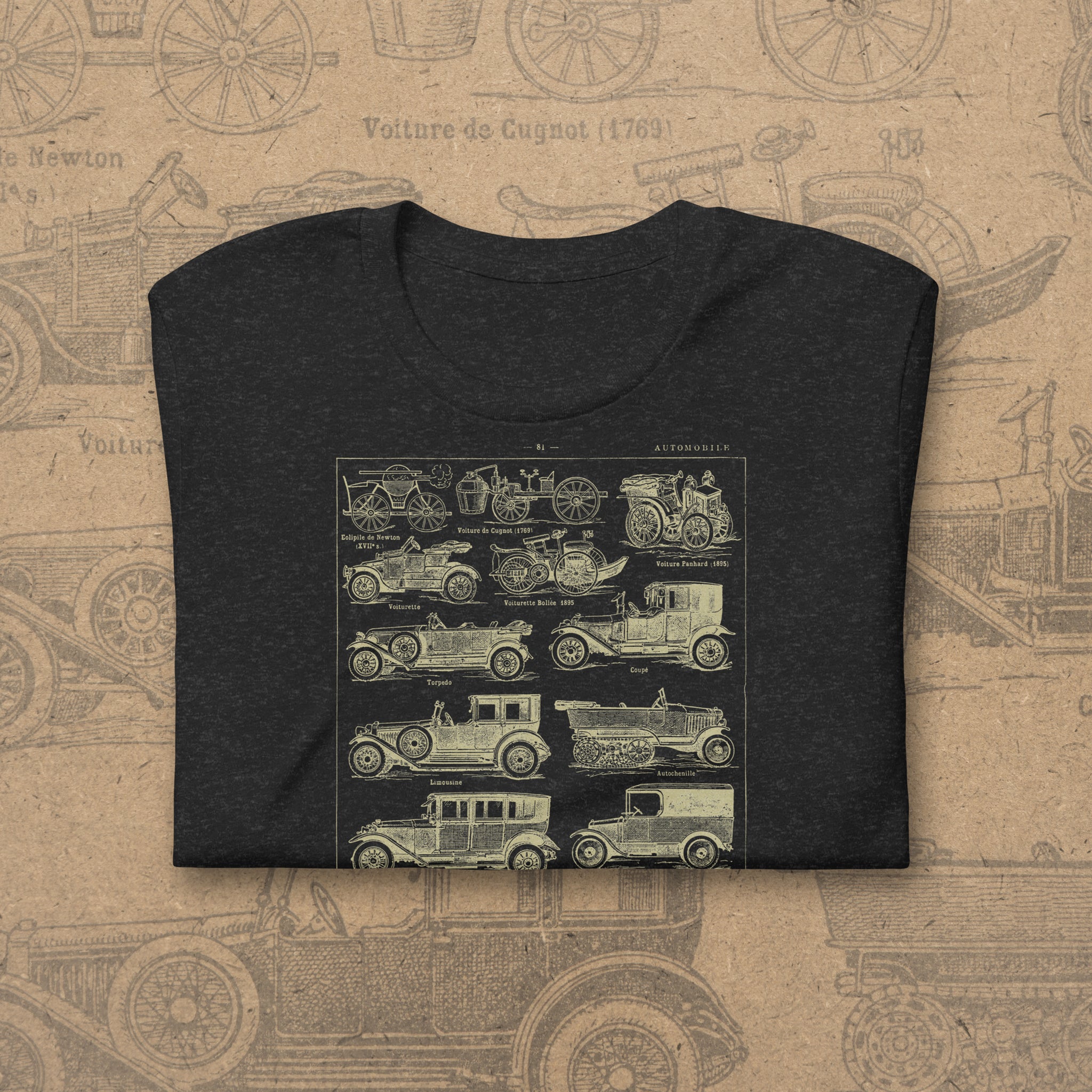 This vintage automobile t-shirt feels like a page torn straight from a 1930's French language dictionary - because it is! No AI design here - only real historic artwork. The design features a beautifully detailed antique illustration showing the evolution of early automobiles, from steam-powered curiosities to classic motorcars, buses, and taxis. Each vehicle is labeled in an old-world style, giving the shirt the look of a historical diagram. The warm, aged-paper tone of the artwork adds to its nostalgic, scholarly charm and makes it instantly eye-catching.