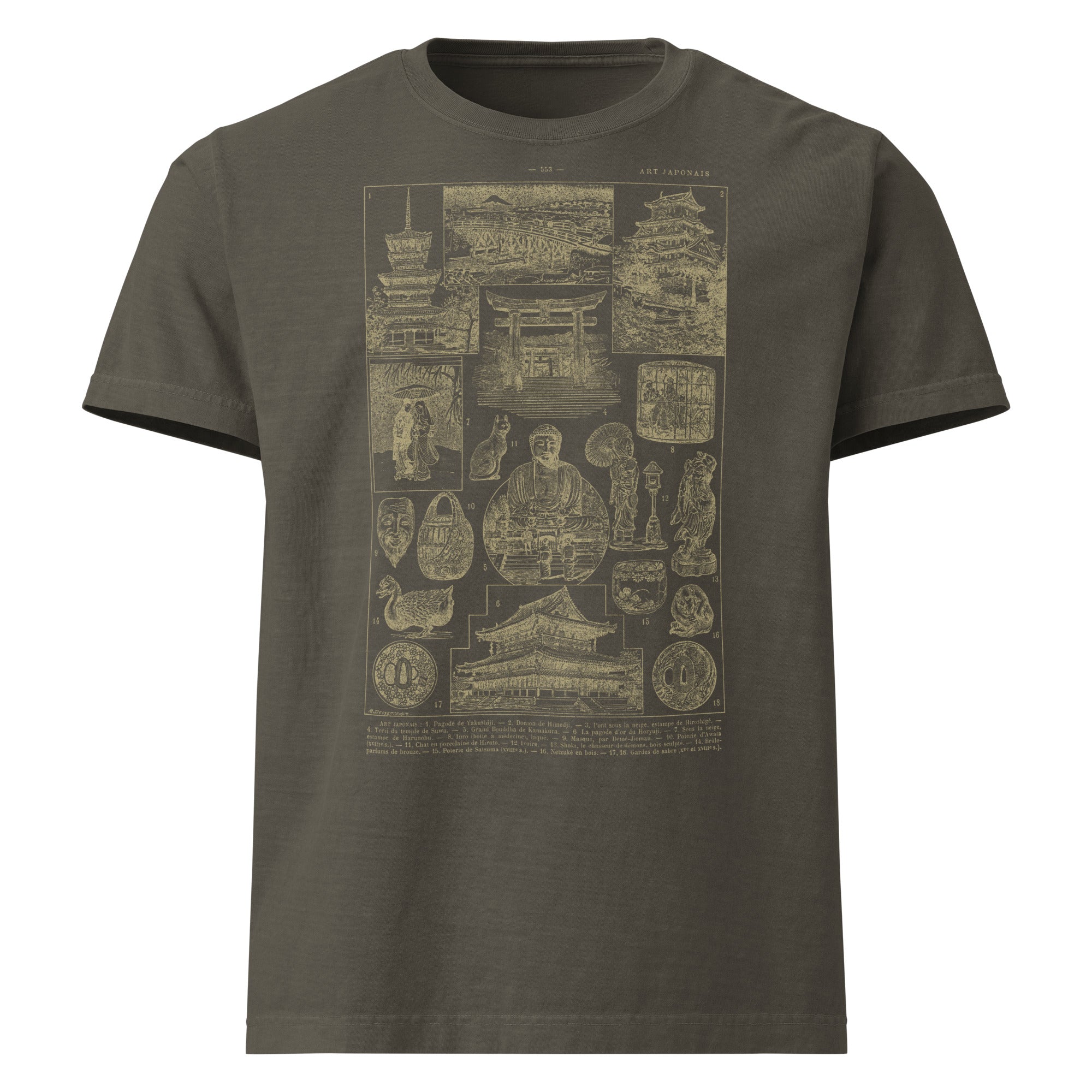The image on this shirt comes from the "Pictorial Illustrations" section of a 1920's French Dictionary - a very thick and heavy book! It includes example drawings of Japanese art, architecture, and culture; including the Yakushiji Pagoda, the Great Buddha of Kamakura, medicine boxes, art, paintings, pottery, wood carvings, sword guards, and even a porcelain cat!